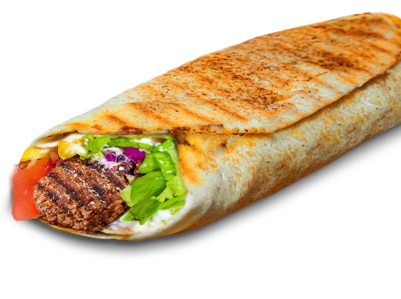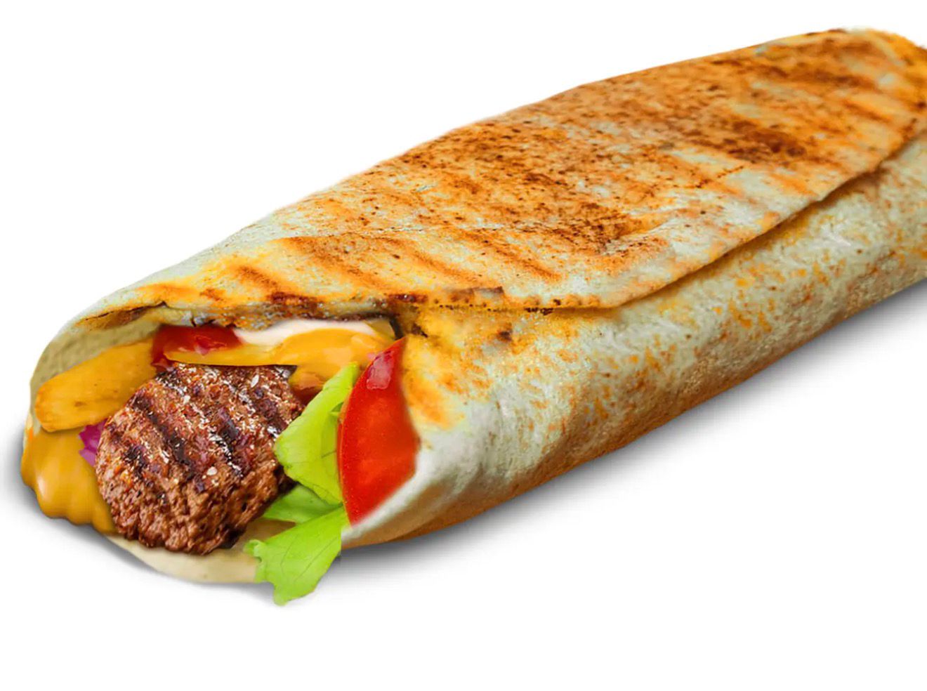 Qburger Pão Sírio, alface, tomate, cebola, batata frita, ketchup e maionese, mostarda, queijo e Kafta